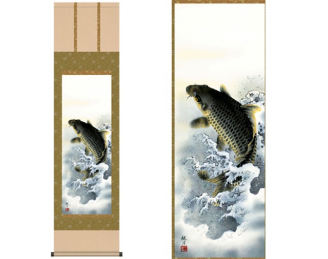★「大勝利」に通じる「大昇鯉」。 *古来、激流を遡る鯉が龍神となって天へと羽ばたいたといわれる 登龍門の故事にもとづき、豪快に水飛沫を上げ勢いよく跳ねる鯉を、 迫力あふれる趣で描き上げた人気の構図です。 *涼しげな趣が夏の床の間に涼風を誘うことでしょう。 *ご一家代々の末永い繁栄を祈ってお飾りいただきたい吉祥作品です。 現品サイズ 44.5 × 164 cm 個装サイズ 14 × 54 × 10 cm 現品重量 個装重量 約 1.0 kg 個装状態 化粧箱 生産国 日本 規格 <材質> 作品部分 / 布製(特製新絹本・高精細版画+手彩色) 表装裂 / 洛彩緞子 軸先 / 陶器製 *十年間表装品質保証付き 注意事項 □注意□ ※受注生産品に付き、出荷に1週間ほど要します。 良品返品はご容赦ください。 商品管理番号:K9959