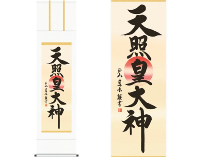 ★伊勢神宮式年遷宮記念企画としてお薦めします。 *豊作と幸福を司る太陽神であり、伊勢神宮の祭神最高位にある天照皇大神。 その偉大なるご神徳をもって大いなる繁栄と平安をもたらすといわれる、神々しさこの上ない作品です。 日の本の国の象徴である水平線から昇りくる旭日を描き添えた一幅を、秋の豊作祈願 をはじめ、新たなる年をお迎えするお正月や、日常掛けとしてもお薦めいたします。 *穢れのない純白の糸を用い、織り柄を配した瀟洒な白綸子を奢り、丹念に仕立て、十年間表装品質保証をお付けしてお届けいたします。 ※綸子(りんず)とは純白の糸を用い、織り柄を入れて織りあげた織物です。 サイズ・容量 現品サイズ 44.5 × 164 個装サイズ 約 54 x 14 x 10 cm 現品重量 約 500 g 個装重量 約 1 kg 生産国 日本 規格 <材質> 作品部分: 布製(特製新絹本・高精細版画) 表装裂 : 白綸子(御神号表装) 軸先 :陶器製 化粧箱収納 十年間表装品質保証付き 画寸 :31×89cm 注意事項 □注意□ ※受注生産品に付き、出荷に1週間ほど要します。 ※良品返品不可。 商品管理番号:K10556