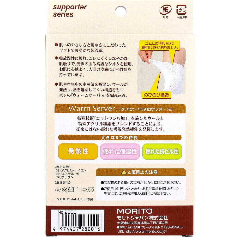 ●肌や空気中の水蒸気を吸湿し、ウールが発熱し、熱を逃がしにくい構造をもつ東レの「ウォームサーバ」を編み込み。