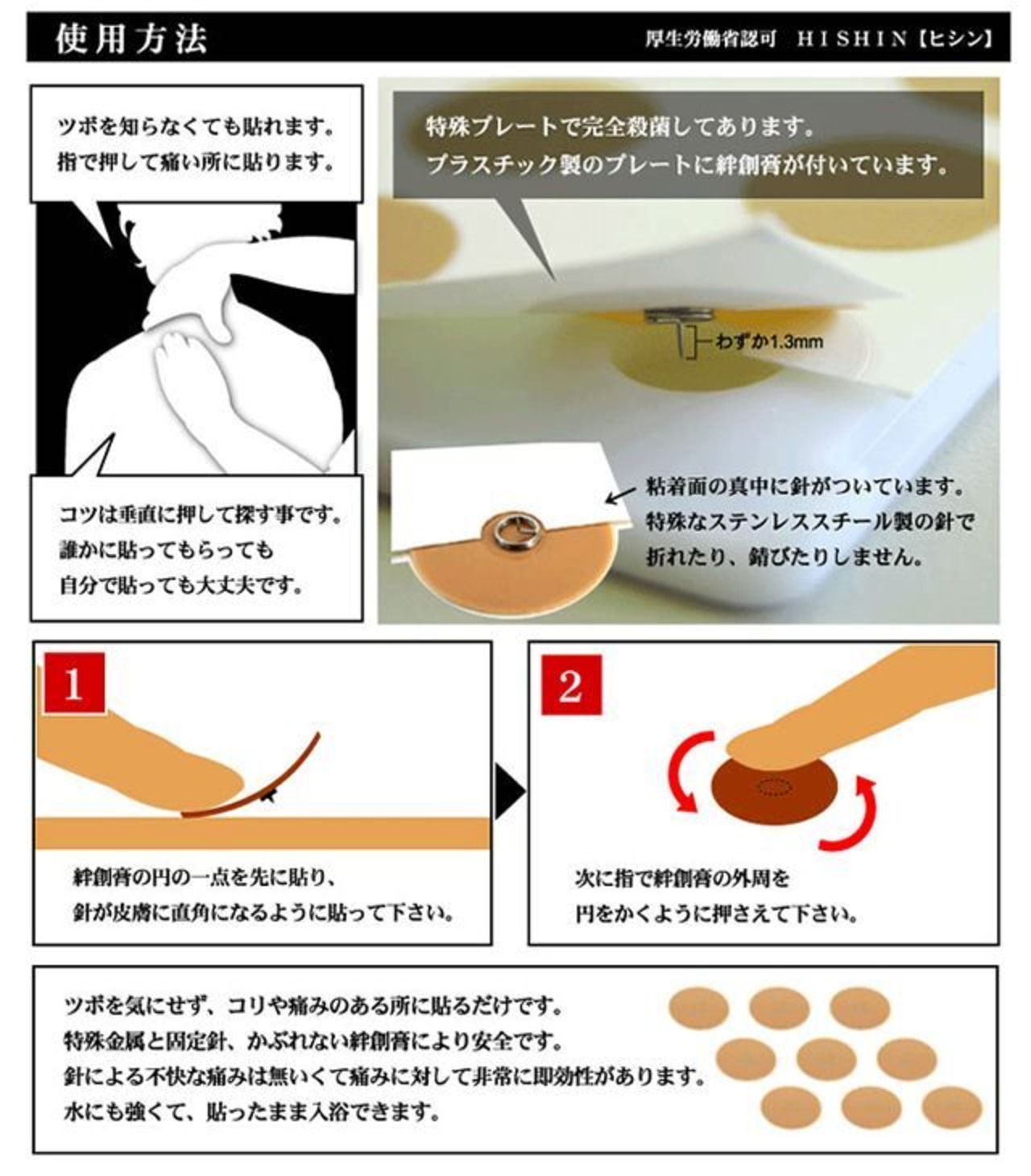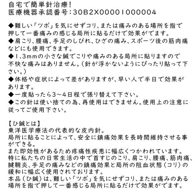 ◆1.3mmの小さな鍼でこりや痛みのある局所に貼りますので不快な痛みはありません。(針が浮かないようにぴったり貼ってください。)