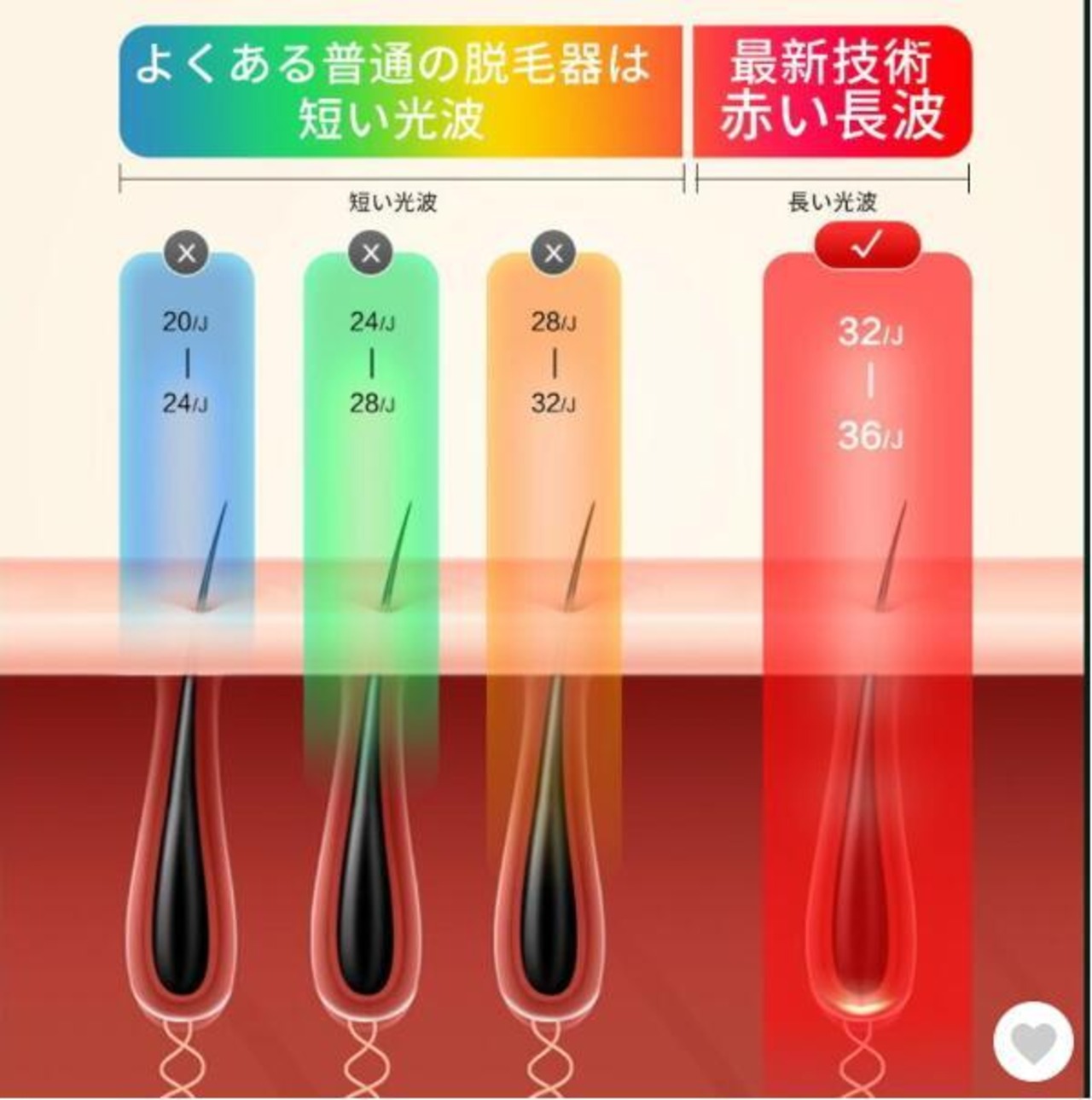 照射強度は5段階に調整可能で、肌の調子や肌の明るさに応じてフラッシュレベルを使い分け、肌の耐性に応じて、不快感や痛伴わない脱毛を実現します。