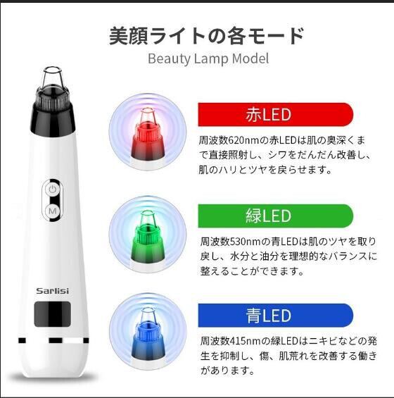 3色フォトンライト、真空吸引の機能を搭載して、5つの吸引ヘッドが付き、黒ずみ、余分皮脂など皮膚問題を改善可能です。