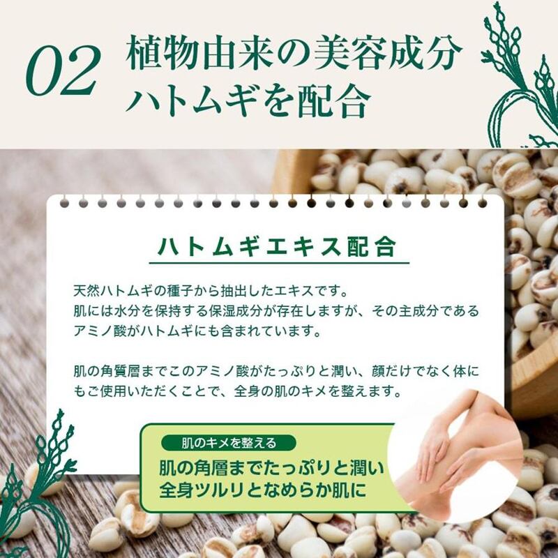 ハトムギエキスはさまざまなアミノ酸をバランスよく含むことから、肌の保湿効果はもちろん、