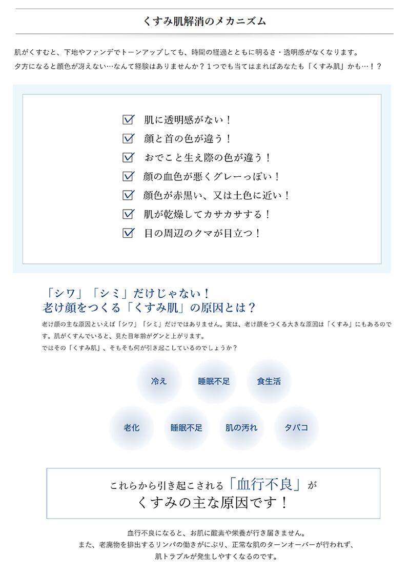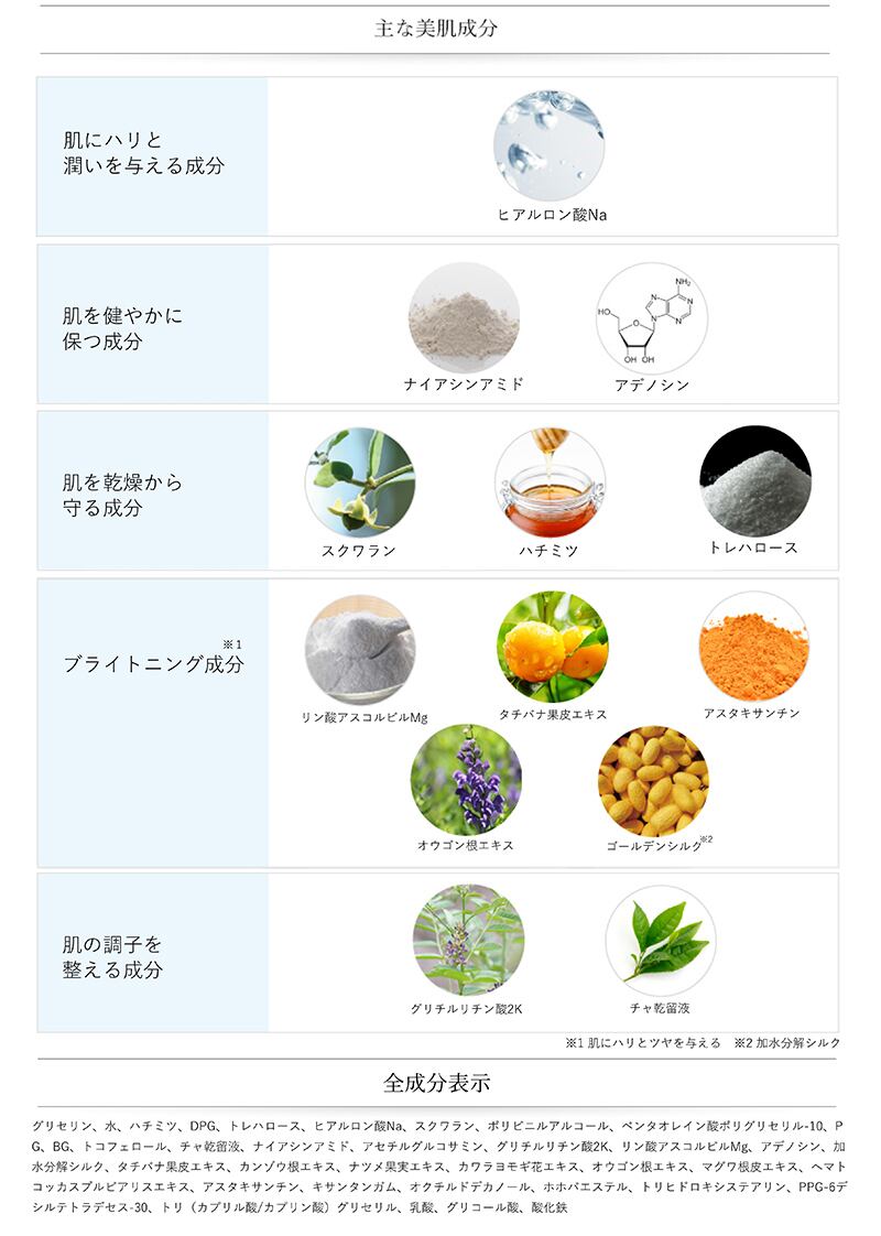 グリセリン、水、ハチミツ、DPG、トレハロース、ヒアルロン酸Na、スクワラン、ポリビニルアルコール、ペンタオレイン酸ポリグリセリル-10、PG、BG、トコフェロール、チャ乾留液、ナイアシンアミド、アセチルグルコサミン、グリチルリチン酸2K、リン酸アスコルビルMg、アデノシン、加水分解シルク、タチバナ果皮エキス、カンゾウ根エキス、ナツメ果実エキス、カワラヨモギ花エキス、オウゴン根エキス、マグワ根皮エキス、ヘマトコッカスプルビアリスエキス、アスタキサンチン、キサンタンガム、オクチルドデカノール、ホホバエステル、トリヒドロキシステアリン、PPG-6デシルテトラデセス-30、トリ(カプリル酸/カプリン酸)グリセリル、乳酸、グリコール酸、酸化鉄